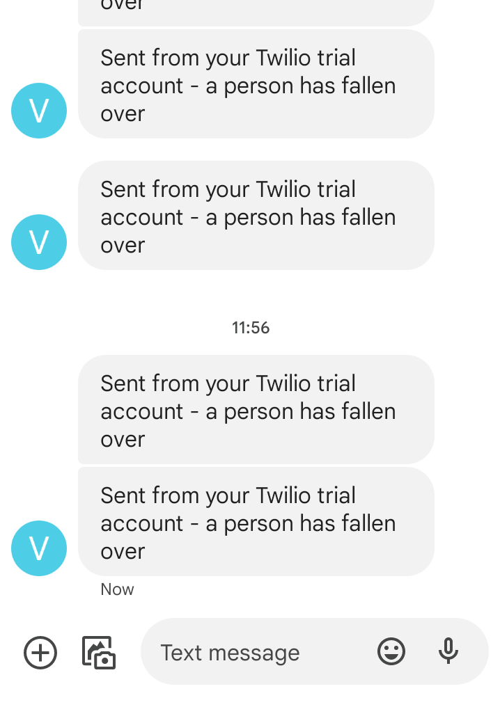 In week 12 the second version of the human detection code with fall detection was created. To broadcast the message that the person had fallen over, the Twilo api was used. Twilo are a company that creates tools to send messages over the internet such as sms and mms.