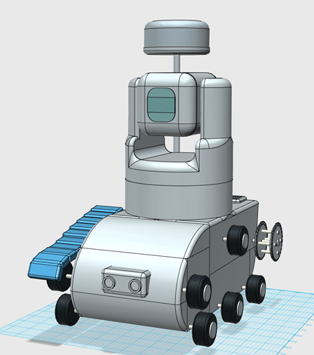 This version of the device includes a tracked robot body with two aditional sensors. The lidar unit needs an unabscured view to get proper reading and so is placed ontop of a pole at the back of the unit. The Ultrasonic sensor is located on the front of the unit. These two sensors would be a Lidar unit to map a room and patrol it and an ultrasonic sesnor as a backup sensor so that the robot did not crash into anything.