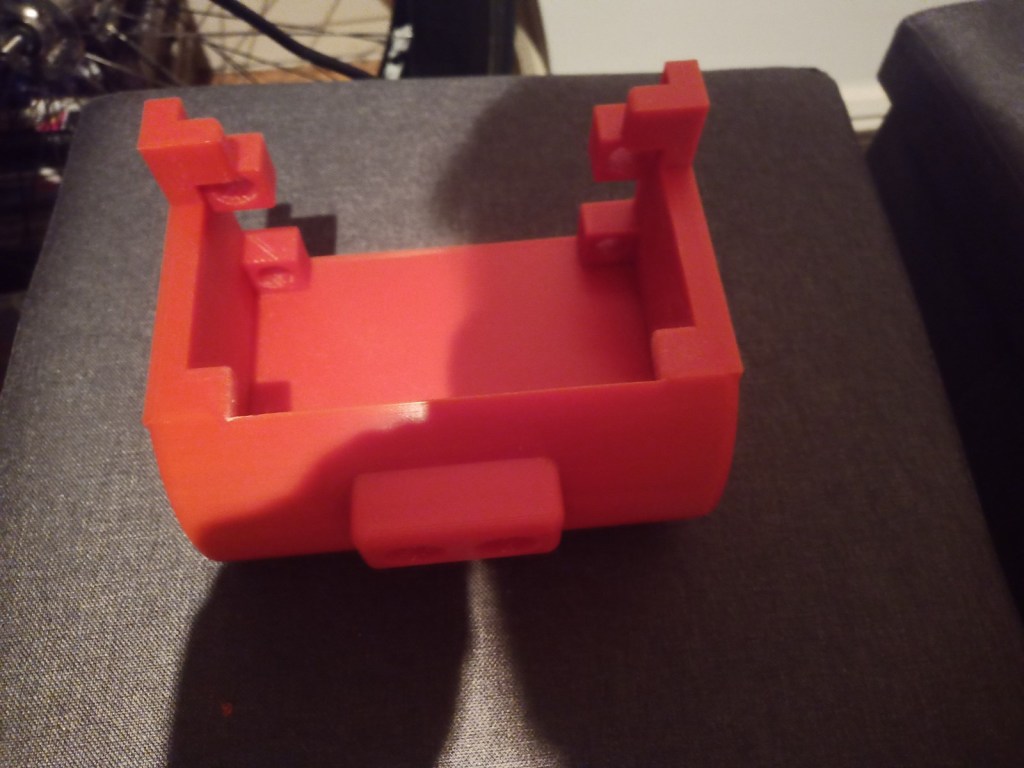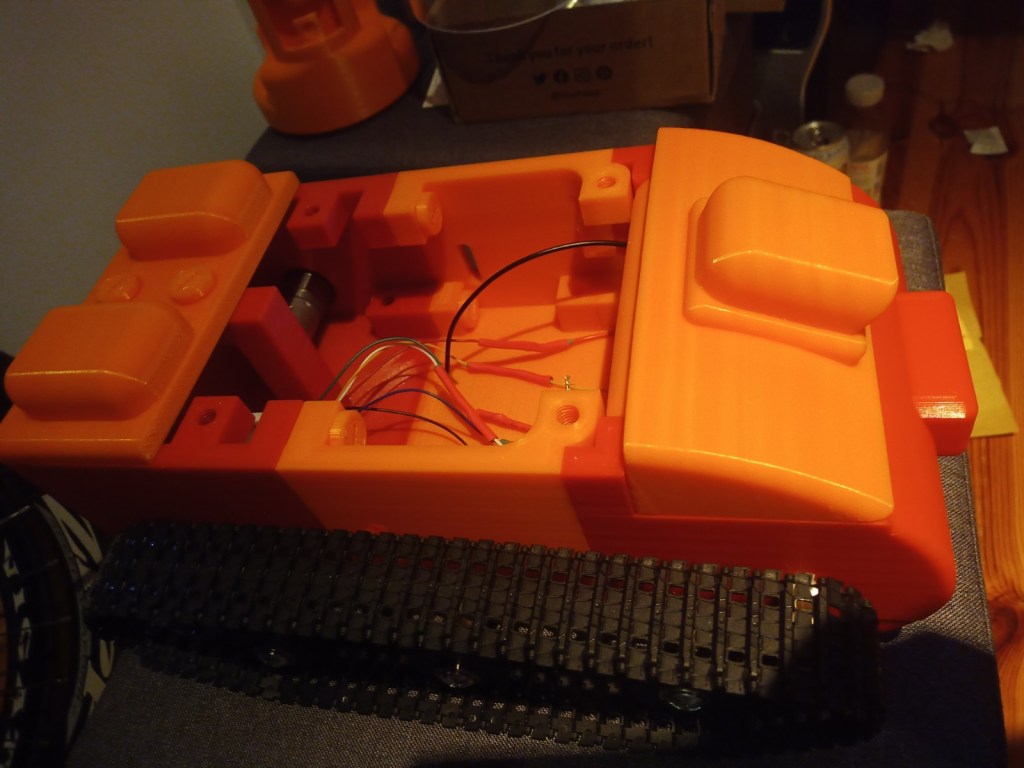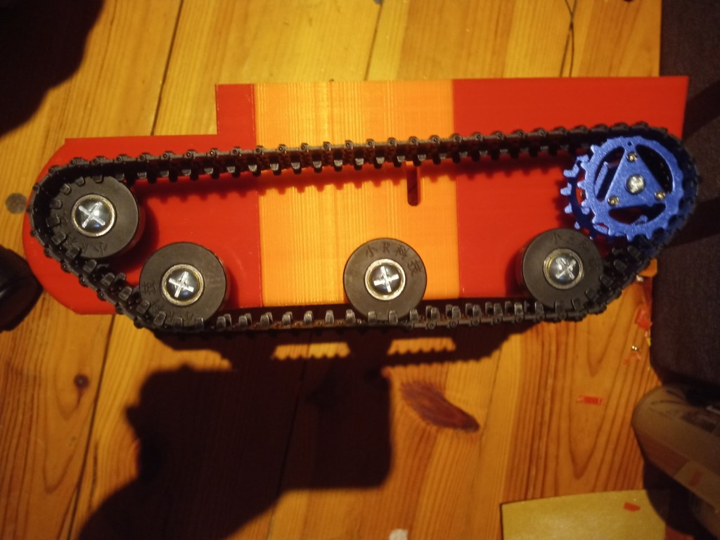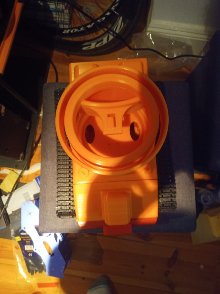 Some more parts were printed and then reprinted after some mistakes were realised. On the front of the tracked chassis the area for the ultrasonic sensor was too small and the printer settings made the part quite fragile. The botom part where the wheel axils was rounded making it dificult to insert nuts into. this was the same for the middle part and the end part of the robot frame.