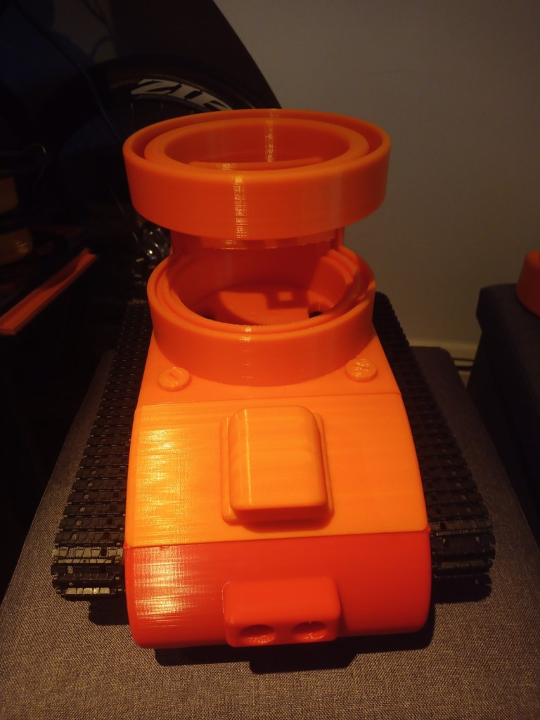 The Lidar unit has also been relocated to beneath the camera enclosure to try to lower the centre of mass. This new Lidar enclosure also gives the Lidar a bit more protection as there is an acrylic cylider surounding it. Thereis a tradoff to the new design though, this is that the Lidar is partialy blocked from the back 60 degrees. This new design is safer than the previous design as since the lidar is enclosed nothing can get cought on it.