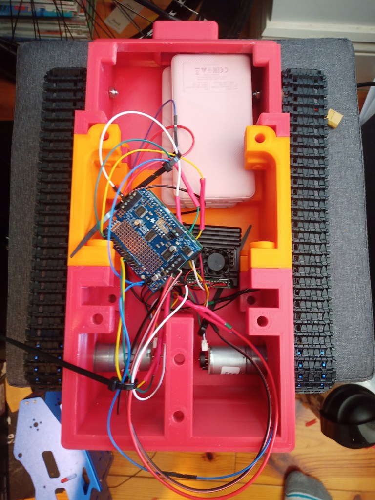 The components were fitted inside. These included an arduino Uno, two raspberry pis, a motor driver for the motor encloders and two battery banks(one for each raspberry pi):